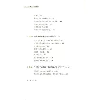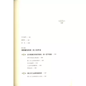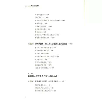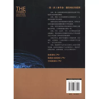 第一次工業革命造就了密集的城市核心區、拔地而起的工廠 第二次工業革命催生了城郊大片房地產業以及工業區的繁榮 第三次工業革命將會把每一棟樓房轉變成住房和微型發電廠 如何轉變經濟發展方式?如何保持經濟的可持續發展? 站在人類發展歷史與未來的高度,面對數百年一遇的發展機遇,我們似乎找到了中國經濟發展的希望——可持續發展是方向,轉變經濟發展方式是途徑,而第三次工業革命就是我們的藍圖。