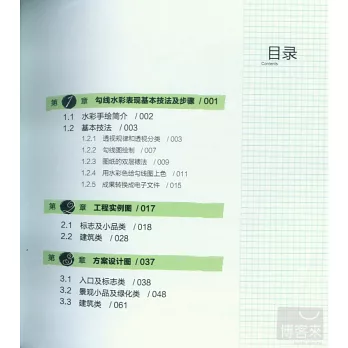 分三章,第1章對勾線水彩表現基本技法及步驟進行了簡單描述,第2章是規劃設計前的效果圖與項目建成之後的實景照片,第3章是部分規劃設計效果圖。