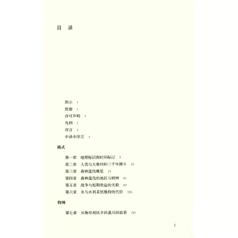 書的第一部分討論了大象南撤、森林破壞、戰爭、水利系統對環境的影響,勾畫出中國環境史的「一幅總圖」;第二部分選擇浙江嘉興、貴州苗族原居地和河北遵化三個典型地區的個案,用「特寫鏡頭」對「總圖」進行細化和強化,具有濃厚的經濟一社會史色彩;第三部分以「大自然的啟示」、「科學與萬物生靈」、「帝國信條與個人觀點」三章考察了中國歷史上的環境觀念、情感、知識和「天人感應」思想及其影響,給出了如何理解中國環境史的一種文化視角。