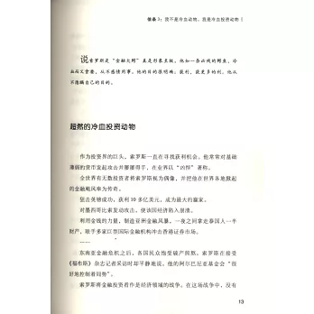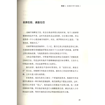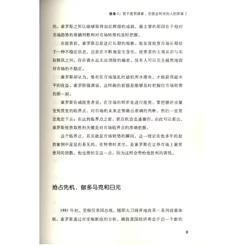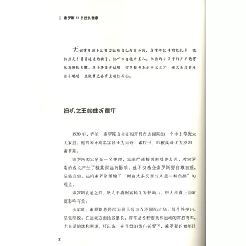 本書根據索羅斯在金融投機生涯中的真實案例,結合其哲學思想,分析如何把握市場轉變的時機、如何面對不利的市場行情並及時調整對策等,總結出索羅斯在從事投資中所恪守的32個信條。這些信條涉及到眼光、心態、信息、學習與成長。