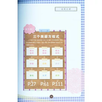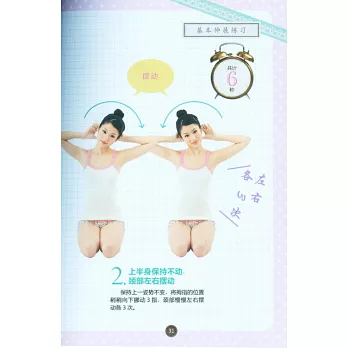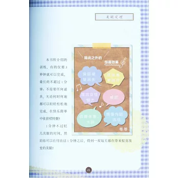 是日本最權威的美體教母齊藤美惠子20多年來最滿意的美體書日本最著名的腿部理論師,齊藤美惠子根據25年腿部訓練經驗,在成功塑造了兩萬多女性完美腿形的基礎之上,將訓練方法編著成書。全書圍繞「旋轉」「擺動」兩個動作展開,用伸展的方式拉伸腿部肌肉線條,用關節的訓練塑造肌肉曲線,以正確的步行方式維持腿形,最終打造所有女性夢寐以求的美麗雙腿。動作簡單易行,大部分動作10幾秒鍾即可完成,最長也只需要1分鍾,非常適合忙碌的職業女性。