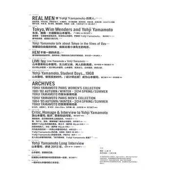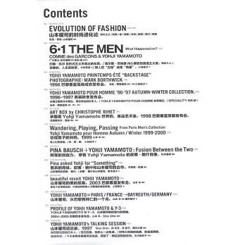 本書呈現了山本耀司四十年設計生涯的軌跡,精選了不同時期對山本耀司的深度訪談,其中不僅涉及其對服裝和設計的激進思考也包括其對時尚和社會潮流的深刻洞見。對皮娜•鮑什、維姆•文德斯等摯友的采訪,*從另一個維度展現出一個獨特堅定且富有創造力的山本,他對音樂的熱愛以及和女兒之間微妙的父女之情都讓我們看到這個瀟灑男人內心深處的細膩情感。文中還通過多樣化的方式記錄了多場震撼人心的時裝發布現場,看山本耀司如何用時裝向這個世界重重的揮拳。