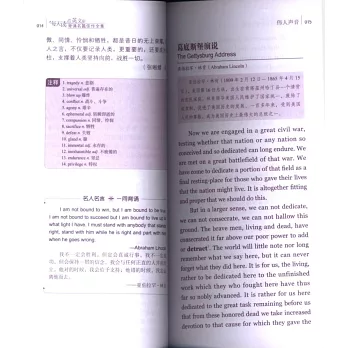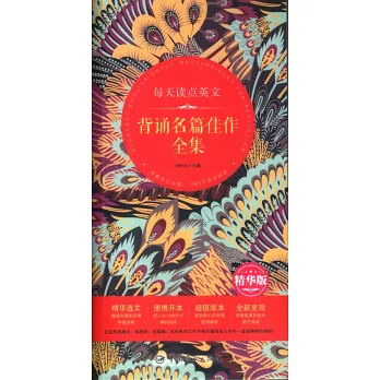 精選篇名人佳作中適合背誦的經典選文,分為十個篇章,包括華盛頓、林肯、傑斐遜等「偉人聲音」篇,莎士比亞、勃朗寧等「愛情絮語」篇,《哈姆雷特》《霍比特人》等「人物側影」篇,愛因斯坦、卡耐基等「成功箴言」篇,羅素、梭羅等「哲理人生」篇,濟慈、海明威等「風景依然」篇,培根、赫胥黎等「學海之津」篇,《夜鶯與玫瑰》《老人與海》等「故事寓言」篇、《倫敦的叫賣聲》《美國夢》等「民族性格」篇,以及《悼念戴安娜王妃》《哦,船長!我的船長!》等「溫情追憶」篇。
