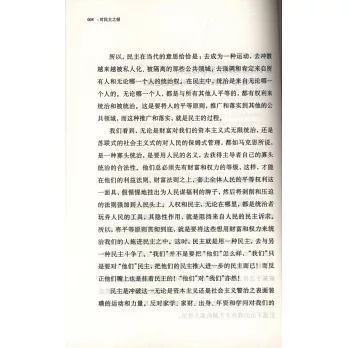 與這一憎恨相伴的歷史從一開始就見證了它的諸多批判形式。這類批判承認某些事物是存在的,但這是為了限制管控它們。批判民主的歷史形式有兩種,首先是試圖與民主達成一種妥協的貴族立法者和專家的技藝,民主被其視為無法忽視的事實。美國憲法的擬定是這種調和各種力量和平衡制度設置以最大限度地擺脫民主(這一事實)的工作所締造的經典范例,並且一直以來,憲法都是為了保護兩個被視為同義的事物而嚴格地限定着民主,即最優秀者的統治和對財產秩序的維護。這一批判行為的成功也自然而然地促成了其對立面的成功。青年馬克思毫不費力地揭示了財產的統治權是建立在共和國憲法的基礎上。共和國的立法者也毫不隱瞞這一點。但至此馬克思的思想資源還未枯竭,他繼而又提出一套思考范式:形式民主的法律和制度只是一種表象,在其之下並將其作為工具的,是由資產階級所行使的權力。於是反抗表象的斗爭就成了通向「真正」民主的路徑,自由和平等將不再被國家與法律機構所代表,而是體現在具體的生活和情感體驗之中。