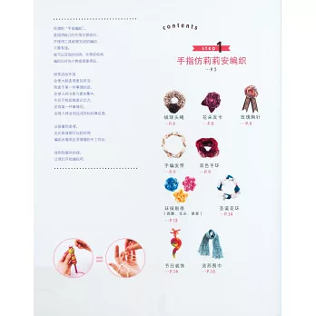 介紹了三種編織方法,分別為「手指仿莉莉安編織」「手指仿鉤針編織」「手指仿棒針編織」。從step1的手指仿莉莉安編織到step3的手指仿棒針編織,難度是逐漸增加的,因此,請參考《無需編織工具!一學就會的奇妙手指編織》中的分類介紹,選擇想要編織的作品。