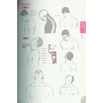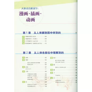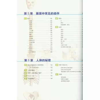 全書共6章,通篇講解細致,配圖到位,畫面效果非常生動。第1章介紹了人體動態解剖的基礎知識,包括骨骼的形狀與區別、骨骼的划分、關節的種類/運動方向和肌肉的種類/運動方向。第2章介紹了人體各部位的常見動作、骨骼和肌肉,包括頸與肩的肌肉和骨骼、肩部的動作、手臂的肌肉與骨骼、手臂的大小與平衡、肘部的關節與動作,以及肘部周圍的凹凸等內容。第3章介紹了日常生活中常見姿勢的解剖學知識,包括坐、走路、跑步、跳、睡覺、抬起、伸展、蜷縮、吃、喝、上下台階、蹲和騎自行車等內容。