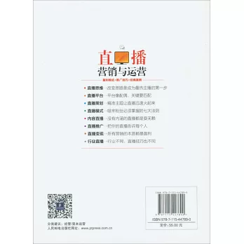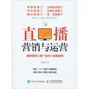 《直播營銷與運營:盈利模式+推廣技巧+經典案例》圖文並茂、案例新穎、實用性強,非常適合創業者、營銷人員以及企業管理者等人士閱讀參考。