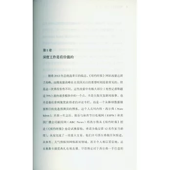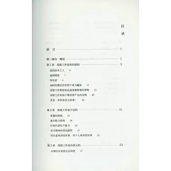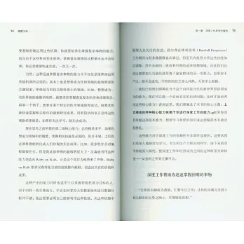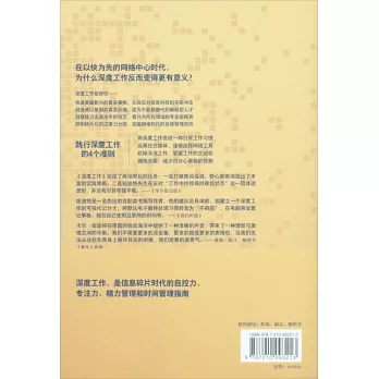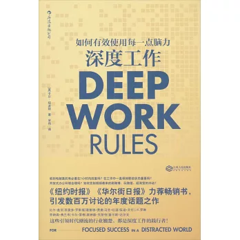 作者創立的「深度工作」概念,其含義為在無干擾的狀態下進行專注的職業活動,使個人的認知能力達到極限。而正因為當前社會深度工作能力的日益稀缺,其與經濟成功的關系也變得日漸緊密起來。本書的所有討論也圍繞「深度工作」而展開,全書共分為兩部分:在*部分中,作者從神經科學、心理學、哲學等角度,客觀地分析了在新經濟形勢下實現深度工作的重要性。第二部分則系統地傳授了在日常生活中踐行深度工作的具體策略,如將深度工作納入日常工作進程、提高大腦的深度思維能力、遠離社交網絡等。