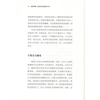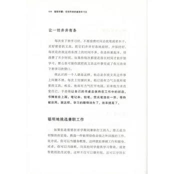 本書圍繞「如何更省時高效地學習並提高成績」這一主題,生動系統地為讀者詮釋了提高學習效率的關鍵法則。本書分為三大部分:高效學習、成功應試和正確思考。第壹部分「高效學習」,闡述了如何理性規划讀書時間,如何記筆記等,並提供了實用的閱讀技巧和記憶技巧;第二部分「成功應試」,與讀者探討如何在考試以及面試時發揮自己的佳表現,這部分主要涵蓋的主題包括考前准備、筆試與口試的應試技巧;第三部分「正確思考」,提出了如何憑借動機、目標,以及正確的心態,來提高我們的學習成績和臨場發揮。全書搭配簡單有趣的漫畫,每節后面附有總結,方便讀者閱讀。