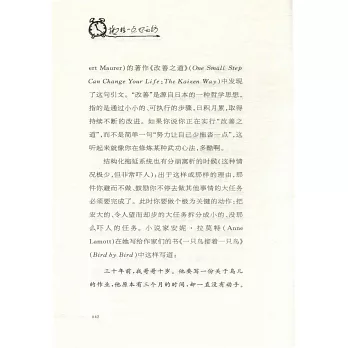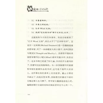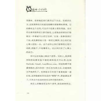 資深拖延者兼堂堂哲學家佩里教授,在這本風趣機智的小書中為拖延者翻了案。其實,大部分拖延者都不是一事無成的窩囊廢,在逃避那些「本該做的事情」的同時,拖延者們還是卓有成效地完成了不少其他事情嘛。在這本充滿哲思的小書中,佩里慷慨地分享了他多年來得出的一套戰「拖」心法。比如,拖延者可以利用自己的畏難心理,調整待辦事項清單,辦成不少不那麼重要但也挺重要的事情,例如:第一項,學外語;第二項,翻修廚房;然後你就可以很驕傲地說,我做完了第三項,遛狗。拖拖拉拉不是罪。最重要的是,佩里希望拖延者們能夠不再從心理上「對抗」拖延,而是學會「接受」自己的做事習慣,並聰明地利用它。畢竟,沮喪和罪惡感只會加重我們拖延的慾望。多年來,佩里一直有心要為《結構化拖延法》添加內容,不料積習難改。如今,沿著這篇短文的思路,同時拖著作業不改,論文不看,佩里終於為自己正了名——他確實寫完了這本書,在首次提出該理論僅僅15年之後。