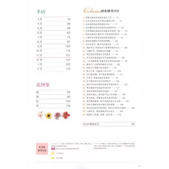 你是否想一年四季時時與花相伴?你是否想在某個特殊的日子用與之相稱的花藝來裝扮房間?《花語/花時間》將為你介紹春夏秋冬四季的應季花卉,同時附上絕妙的創意插花方法,讓你在12個月里總有不同的鮮花常伴左右。在學習過每月的花藝製作方法后,還有如美麗的花之季語供你賞析。