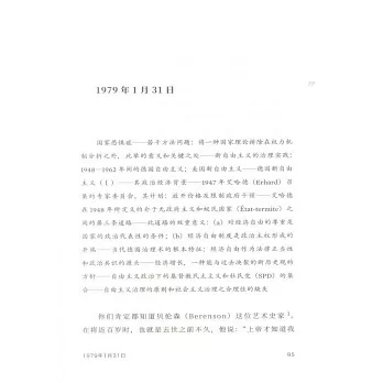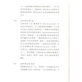 雖然有許多問題可能連許多資深的研究者也不見得有一個確定的答案,比如說:新自由主義的未來?這太過弔詭的問題,便回頭質疑是否新自由主義本身能否比做一種「後資本恐怖主義」的變形?作者在讀傅柯的講稿同時,也一併在讀他的其他著作;如《必須保衛社會》、《性史》、《規訓與懲罰》、《古典時代瘋狂史》⋯另外還有行人出版的《外邊思維》。主觀認為傅柯是一個十分跳躍性思考的人。這樣說不是一種挑釁,也並非惡意批評。受過學術訓練的人,大部分會希望能夠井然有序,以具邏輯性的處理可得的文獻、甚至是關於思想史的史料。但傅柯很顯然就不是一個這樣的作者。在閱讀進行當中,就常常被他講稿所列舉的諸多例子給拉離核心議題。