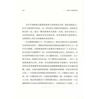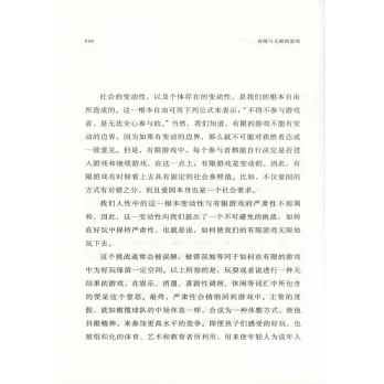 在這本書中,卡斯向我們展示了生活中兩種類型的「遊戲」:「有限的遊戲」和「無限的遊戲」。有限的遊戲,其目的在於贏得勝利;無限的遊戲,卻旨在讓遊戲永遠進行下去。有限的遊戲在邊界內玩,無限的遊戲玩的就是邊界。有限的遊戲具有一個確定的開始和結束,擁有特定的贏家,規則的存在就是為了保證遊戲會結束。無限的遊戲主張「為了遊戲而遊戲」,在這裡,規則要保證遊戲的無限性,所以規則是可變的。最恰當的例子也許就是「人生」。