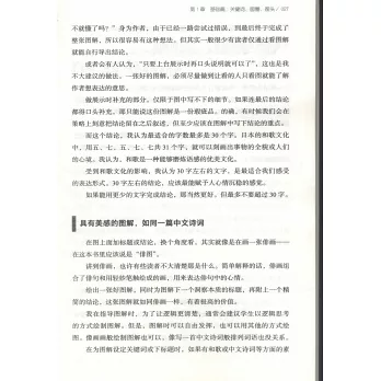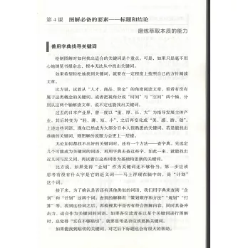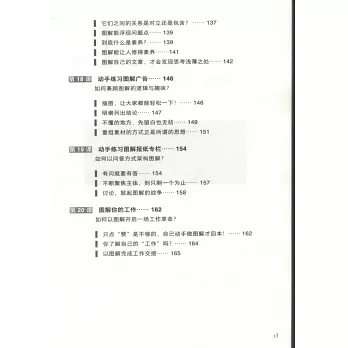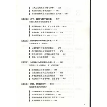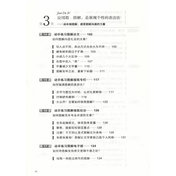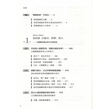 本書分三大部分,分別介紹了圖解的基本方法,即用關鍵詞、圓圈和箭頭來表達圖解的內容結構及相互關係;如何在不斷修正圖解的過程中促進思考的深入,獲得解決問題的靈感;將圖解應用到實際工作,通過架構充滿個性的圖解讓自我表達更具特色,促進與他人的高效溝通。