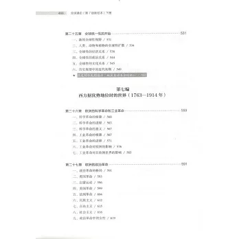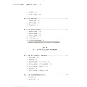 作者著眼于全球,側重於那些有影響的、促進歷史發展的歷史事件,其中包括原始社會、歐亞大陸的古代文明、歐亞大陸的原始文明、歐亞以外的世界、地區分割後的世界、西方世界的崛起、西方人統治的世界、西方的衰落與成功等八個主要的部分。重點突出,主題鮮明,著重有三個主要的問題,即(1)歐洲擴張的根源;(2)歐洲擴張前的儒家文化、穆斯林和其它非歐洲的世界;(3)歐洲擴張的各個歷史時期:伊比利亞時期,荷蘭、法國、英國時期,沙俄時期。下冊的主題是1500年以來,全球化進程日益加速的歷史。