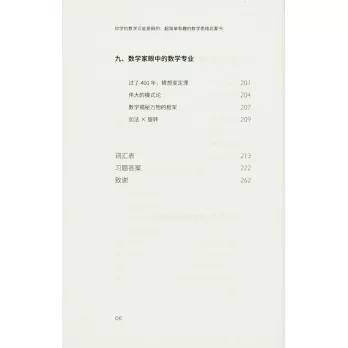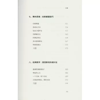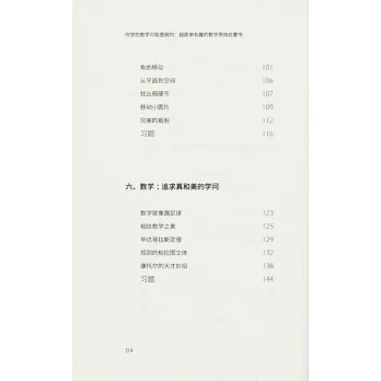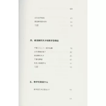 第三部分(後五章),我會帶你踏上一段美妙的數學之旅,這些學校裡可不一定教。哪些技巧能解答看似無解的問題?我會邀請你和愛因斯坦一起,發掘清晰思維的魅力與力量。我也會邀請你把數學看成體驗藝術——而不是用陌生的思維工具做出公式化的解答,不僅如此,我還發現了一個天大的誤解,用醫學術語說,這種可悲的誤解已變成一種“慢性病”。因為本書裡所講的“數學”,跟你們很多人理解的“數學學科”真的沒太大關係。
