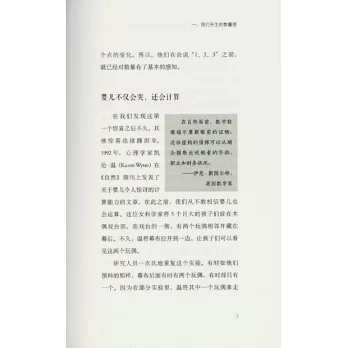 據說,數學把人分成兩種,一種甘之如飴,一種對它怕得要命。數量與幾何,始終深深根植於每個人的意識當中,只是人們往往忽略了這一點。幾個月大的嬰兒就已經會簡單的加法計算,就連猩猩、烏鴉、馬和老鼠都會計算,當它們計算時,也會跟我們犯一樣的錯誤。