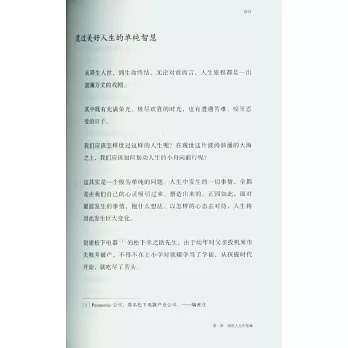 就是這些看上去沒有什麼了不起的方法,蘊藏著人生轉機的力量。如果不想錯過一生幸福,就好好反復閱讀本書,讓自己在心靈深處汲取稻盛和夫的成功力量,去積極探索讓自己幸福的人生吧。