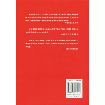 在本書中,米勒定義了民粹主義的核心要素:它反對多元主義,壟斷對人民的定義,剝奪持反對意見者的人民資格;民粹主義並非民主政治的正當組成部分,而是它揮之不去的永恆陰影。