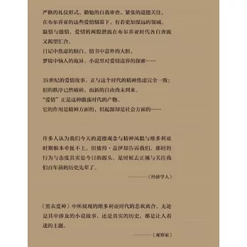 《黑衣愛神》是五卷本文化史著作《布爾喬亞經驗》的第二卷。在本卷中,彼得·蓋伊探索了19世紀中產階級的愛情觀。作者深入研究了大量歷史材料,從哲學論文到醫學文獻,從信件和日記到小說作品,全書充滿了對19世紀西方個人生活和作品的迷人見解——狄更斯、司湯達、瓦格納、王爾德、巴爾扎克、靄理士、佛洛德,還有更多沒這麼家喻戶曉的普通中產階級以及工人階級,他們在愛情中的內心糾葛,他們對欲望的抵抗或妥協,抑或他們對婚姻生活的讚歎。本卷也在愛情的邊界做了充分的探索,談論範圍從同性戀的“發現”,時人對賣淫問題的爭論,對失足女性的改造,到愛欲在音樂、大自然、宗教等領域的策略性轉移,等等。通過對大量文獻進行佛洛德式的精巧分析,彼得·蓋伊認為,19世紀的布爾喬亞們並非如慣常理解的那般在愛情上麻木無措,實際上,他們不僅能夠享受他們的欲望,而且能夠在最崇高的意義上理解愛情。維多利亞時代的愛情比許多人想像得更接近理想——他們在努力讓愛情的兩股潛流(溫情和激情)合二為一。