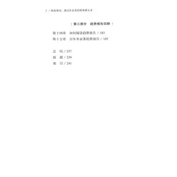 第一部分先介紹非顯著思維者的五種關鍵心態,然後詳細解釋乾草堆法,此法可策展趨勢,將想法付諸實踐。第二部分重點預測十大強勁趨勢,這些趨勢將影響未來十年的社會發展,涵蓋了文化、商業、職場和人文素養等各個方面,每一章也會探究各種大趨勢對現實世界所產生的潛在影響。第三部分回顧了過去九年中的所有趨勢並對每一種趨勢的影響力進行了評級,揭示報告發展過程中的背景故事。