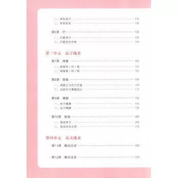 本書將象棋實用戰術共分為4大類、12個細分類別。通過典型棋型、古今名家名局進行分類詳解,並通過實戰棋局講解各戰術的綜合應用方法。不同的戰術配以不同的講解方式,如“捉子”戰術按戰術手段分為“圍困、捉雙、借殺捉子”,在“兌子”戰術則按戰術目的分為“得子、搶先、簡化局勢”,而在“堵塞”戰術中,則是按使用場景分為“堵塞將路和堵塞象眼”,非常適合有一定象棋基礎的愛好者用來學習和參考,從而快速提升中局戰術水平,有效提升棋力。