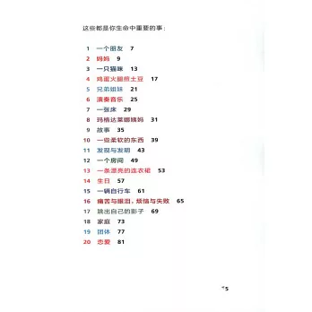 本書以別緻的視角,介紹了每個孩子生命裡都需要且不應缺少的20件事。首先,你需要一個真正可以信賴的好朋友,一位能安慰你、照顧你的母親。在重要之事的清單上,還得有一個阿姨或奶奶。你也應該有自己的房間、床、自行車,以及一個寵物,能做自己喜歡的飯菜和演奏音樂。作者也說明了為什麼眼淚、愛情、好的故事也是你生命裡的重要之事。