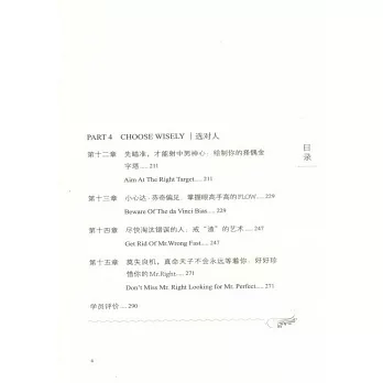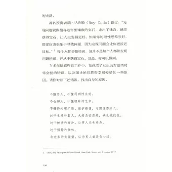 文森老師作為國際知名情感專家,以風趣幽默的語言、生動形象的比喻和引人入勝的案例為你提供這些問題的答案以及讓女性頭疼的情感困惑的解答方案。在書中,作者精心提出了諸如“長期吸引力公式”“愛情博弈論”“擇偶金字塔”“達·芬奇偏見”等等15個戀愛秘訣,幫助你快速成長為高價值女神,從而收穫理想的愛情。