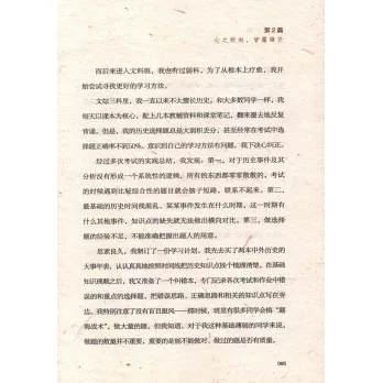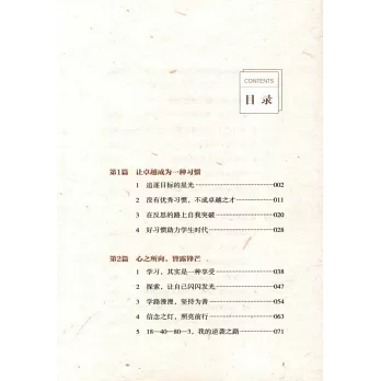 本書由12名清華大學、北京大學學霸從心出發,撰寫而成。書中不僅記錄了學子們的學習方法,還記錄了他們在學習、成長方面的點點滴滴,更是他們對學習的經驗總結與反思。希望在你心中有迷惑、眼中有迷茫的時候,這本書能給予你方向與力量,讓你重獲動力,從而戰勝學習與成長路上的坎坷。最終,你也可以成為別人的榜樣。