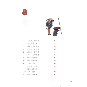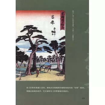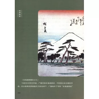 東海道五十三次,指日本江戶時代從江戶到京都的驛道東海道途中所經過的53個宿場。東海道是當時日本最繁華的驛路,也歷來是浮世繪的經典畫題。本書以廣重經典版《東海道五十三次》為主,附以北齋、國貞等大師創作的東海道浮世繪,講解其中的風景故事、地方風俗及各自的藝術風格。