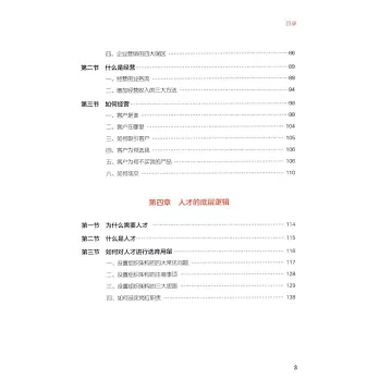 《商業的底層邏輯》共分為八章,分別從戰略、利潤、經營、人才、激勵、分配、績效、預算八個維度為經營者理清商業的底層邏輯。每個維度又從為什麼(WHY)、什麼是(WHAT)、如何做(HOW)3個方面去分析闡述,旨在希望能扭轉企業老闆的認知誤區,減少企業的試錯成本,讓企業學習更系統的經營理念,獲得更快的成長速度和更高的利潤。
