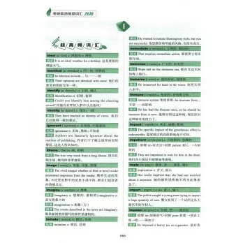 《考研英語高頻詞彙2618》是全國碩士研究生招生考試備考用書,全書共包含四個單元。第一單元是高頻詞彙,編者根據對真題和詞彙考查重點的研究,精選2618個高頻詞彙,幫助考生在短期內高效記憶考研英語詞彙。詞彙講解包含單詞、音標、詞性、中文釋義、搭配、巧記、拓展和誦讀等內容,內容重點突出。第二單元是詞根詞綴,編者以考研大綱英語詞綴為出發點,揭示詞根詞綴的邏輯,使考生懂得基本的構詞法,突破單詞記憶的難關。第三單元是舊詞新說,編者依據歷年真題對單詞熟詞僻義的考查重點,通過真題例句講解單詞的基本意思以及常考僻義,幫助考生掌握高頻“舊詞”的考點。第四單元是必備詞組,編者甄選歷年真題常考詞組,幫助考生在短時間內高效記憶學習常考詞組。