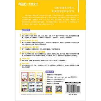核心詞彙——本書收錄美國中小學數學、物理、歷史、地理、生物、藝術等學科的核心詞彙,並輔以插圖和例句,可幫助讀者理解、熟記單詞。