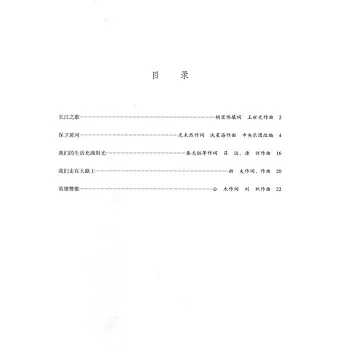 本書曲目包括《長江之歌》《保衛黃河》《我們的生活充滿陽光》《我們走在大路上》《英雄讚歌》。精選的歌曲經典流傳、膾炙人口,反映了時代特徵,書中採用五線譜與簡譜對照的形式,滿足各類讀者需求。