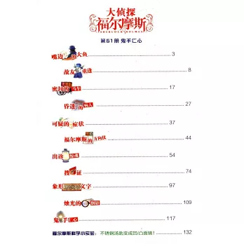 本輯故事為小讀者塑造了一個科學嚴謹,有血有肉的大偵探形象,是一輯偵探迷不容錯過的《大偵探福爾摩斯》。