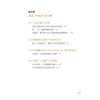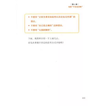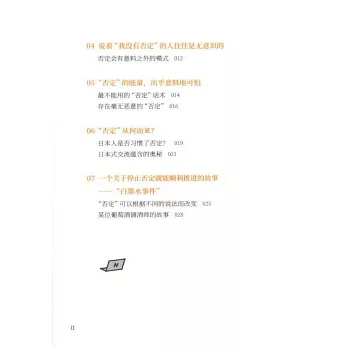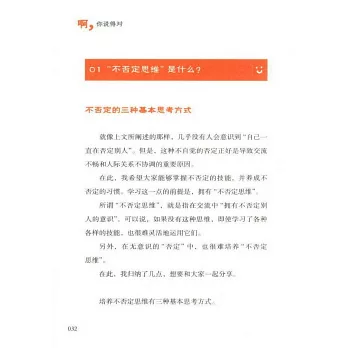 本書作者林健太郎是日本知名培訓講師,輔導超過800位大型企業的管理者。長年的經驗讓他發現,讚美他人固然不錯,但另一種方法更簡單且有效,那就是“不否定”。許多人並沒有意識到自己否定了別人,甚至聲稱自己是“為對方着想才說出那樣的話”。然而,對方卻覺得自己被否定,導致關係的惡化。本書教你“不否定”的心態、技巧與練習,透過傾聽和認可,改變你無意識的否定習慣。你不需要刻意讚美誰,只要專註于提供心理安全感,讓別人覺得無論說什麼都不會被否定,失敗也不會被責備。