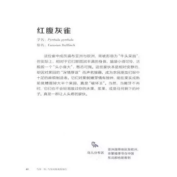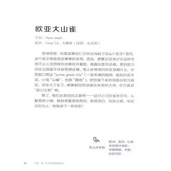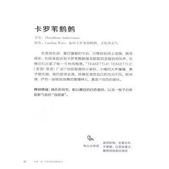 每一篇文章中,都包括了鳥類的基本信息(如拉丁名、分佈地區),用詼諧風趣的語言對這些小鳥進行了科學、簡短而有趣的特性介紹,還詳細而生動地描述了每隻小鳥充滿特色的叫聲、遷徙模式和性格,精心設置了配對遊戲(讓讀者看過之後還能考察自己是否真的學會識別這些鳥兒)、鳥類描述清單、如何識別鳥類的提示(例如,僅僅通過觀察鳥的眼睛,就能獲取不少信息)。