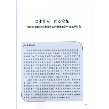 介紹了國內二十多位中小學體育名師的簡歷、教學特色、教學理念、教學亮點、教學育人案例等,展示了名師們獨到的體育教學思想、值得學習的教學成果、豐碩的教學業績和個性化的育人理念,為中小學體育教師、教練等提供了豐富的學習資源和教學思路。這些名師是體育教師隊伍中的育人模範,更是體育教學能手。希望通過展示他們的教學理念、教學成果、教學風格等,為推動中小學體育教育事業的發展貢獻力量。