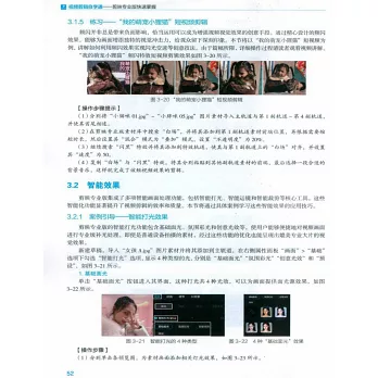 隨後,書中深入探討了核心功能,包括軌道和素材的操作、視頻基礎編輯與摳像技術、人物美顏與美體的多樣化處理方法,以及變速、動畫、跟蹤和調節的多種效果。