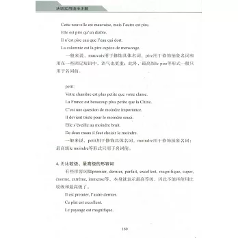 《法語實用語法正解》是配合各種基礎類法語教材而編寫的,從學習法語一步一步遇到的語法點入手,既注重實用性和基礎性,又追求講解的正確性和精確性。在此基礎上,也考慮到每個語法點基本的完整性和相對的系統性,嘗試呈現出法語實用語法的大體框架和基本內容。目的在於讓學生通過基礎階段法語語法知識的正確吸收和準確掌握,為下一步提升法語表達能力和交際能力,打好法語基本功。本書配有大量練習題,並提供答案,方便讀者學習使用。
