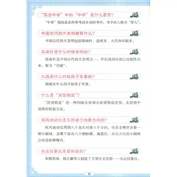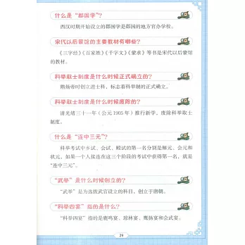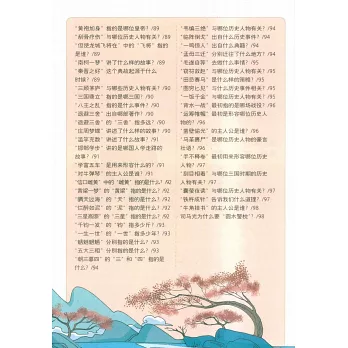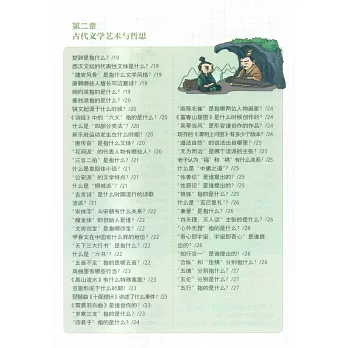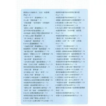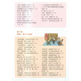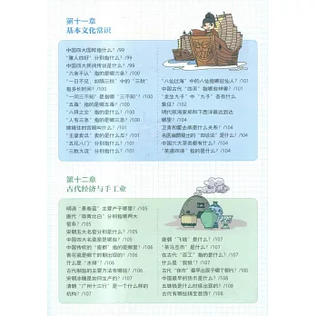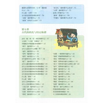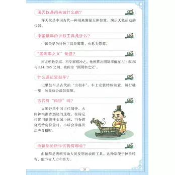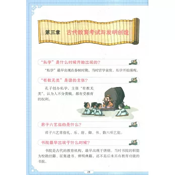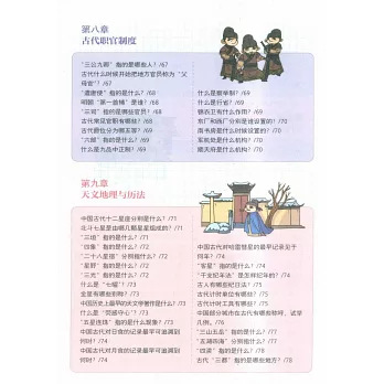 這本書中既涉及《論語》《史記》等經典名作,也有書法、繪畫、戲曲等藝術故事;既講科舉考試如何選拔人才,也介紹了地動儀、渾天儀等古代發明;既有古人穿衣吃飯的細節,也有節日風俗背後的含義,等等。古人的智慧就蘊含其中:他們會用“連中三元”形容考試高手,用“姓氏”區分家族身份,用“禮樂”規範行為舉止。書里用具體例子解釋這些文化常識,不僅有趣,還能讓人感受到古代生活的真實模樣。翻開這本書,你會看到許多有意思的問題。比如,“春秋五霸”都有誰?中國歷史上第一個稱皇帝的人是誰?成語“沉魚落雁”“閉月羞花”分別指的是誰?我國現存最早的中醫理論著作是什麼?古代是什麼時候流行穿褲子的?這些問題看似零散,卻像一塊塊拼圖,慢慢拼出古代生活的完整圖景,就像一幅幅漫畫一樣,映入眼帘。 這本書中既涉及《論語》《史記》等經典名作,也有書法、繪畫、戲曲等藝術故事;既講科舉考試如何選拔人才,也介紹了地動儀、渾天儀等古代發明;既有古人穿衣吃飯的細節,也有節日風俗背後的含義,等等。古人的智慧就蘊含其中:他們會用“連中三元”形容考試高手,用“姓氏”區分家族身份,用“禮樂”規範行為舉止。書里用具體例子解釋這些文化常識,不僅有趣,還能讓人感受到古代生活的真實模樣。