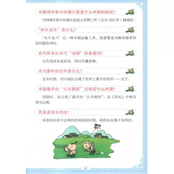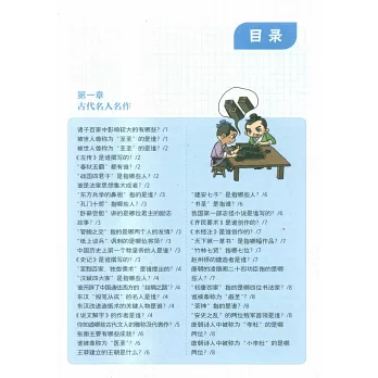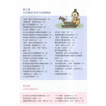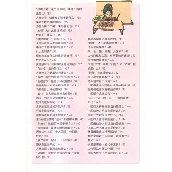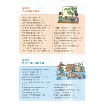 翻開這本書,你會看到許多有意思的問題。比如,“春秋五霸”都有誰?中國歷史上第一個稱皇帝的人是誰?成語“沉魚落雁”“閉月羞花”分別指的是誰?我國現存最早的中醫理論著作是什麼?古代是什麼時候流行穿褲子的?這些問題看似零散,卻像一塊塊拼圖,慢慢拼出古代生活的完整圖景,就像一幅幅漫畫一樣,映入眼帘。