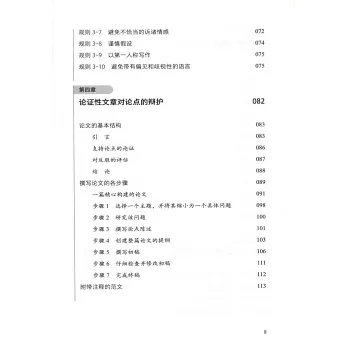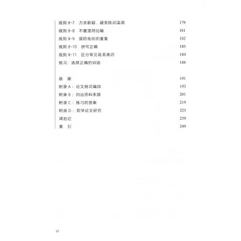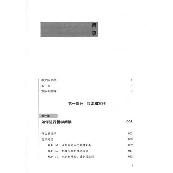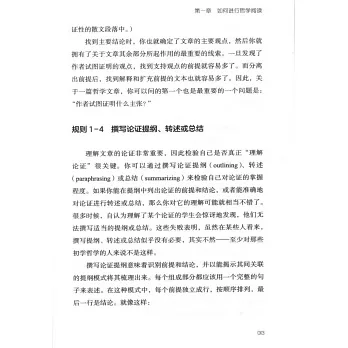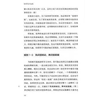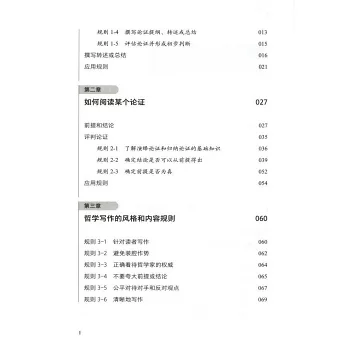 本書首先從哲學閱讀開始講起,介紹了哲學這門學科,以及讀懂哲學文本的規則;其次,介紹了論證類文章寫作的基礎知識和可以快速習得的寫作技巧,涵蓋了整個論文寫作過程,從提出論點、搭建提綱,到完成終稿,以及邏輯論證相關的知識;最後,以好記、易用的規則形式闡述了文章的組織、句子的結構、文獻的引用方式、避免剽竊、語法、拼寫和詞語用法、格式等方面的技巧。