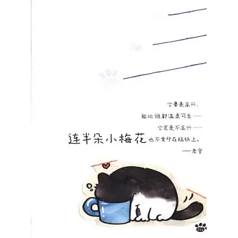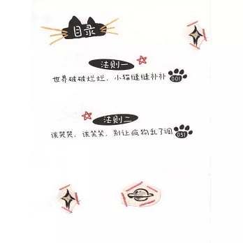 本書為散文集,作者通過觀察分析小貓們的日常行為習慣,從小貓的生活法則“世界破破爛爛,小貓縫縫補補”“該哭哭,該笑笑,別讓瘋狗亂了調”“心安理得地被愛,多曬太陽多睡覺”“大膽表達,世界是個大大的遊樂場”“享受奇奇怪怪,捕捉可可愛愛”這五個主題入手總結從貓身上領悟的生活智慧,幫助我們在面對壓力的時候,找到自己的疏解方式,悠然自得地度過每一天。以尼採的金句中“找到自己的人生劇本”為例子,結合小貓只會按照自己的心情來反饋世界這一行為拓展,啟發讀者一個人面對外界事物時是否回應也應該出自本心。