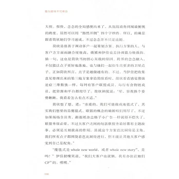 書中有這樣一群姑娘。與色香味趣共舞的念念覺得,人生不過是一方天地和一個男人,守着這方天地、守着這份俗世的溫暖便是幸福。擎畫魔法賽道的伊佳則覺得,最愛的人和最好的朋友都妥妥地“船隊”着便是最滿足的。古靈精怪的嫫嫫則是黏着簡欣,妙語連珠控制着群眾力節奏才會有安全感。相信“光合作用”的簡欣則永遠有一套大視野小生活的欣視界,出世入世行走自如,帶領着姐妹們走出人生大自在。