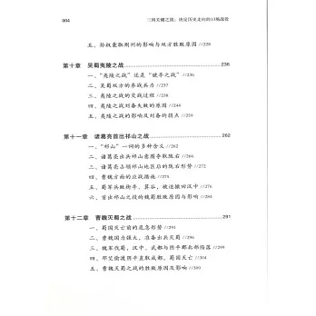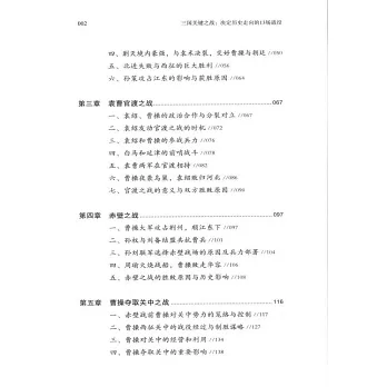 本書論述的是三國時期發生的具有決定性意義的13場戰役。它們分別是董卓與關東諸侯之戰,孫策攻奪江東之戰,袁曹官渡之戰,赤壁之戰,曹操奪取關中之戰,劉備攻取益州之戰,孫劉爭奪南三郡之戰,劉備攻取漢中之戰,孫權襲取荊州之戰等。書中講述了這些重要戰役的背景、過程,以及勝敗原因、特點與重要影響,將其來龍去脈梳理清楚,並總結了其中的經驗教訓。