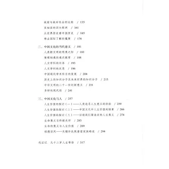 全書內容分為三章:中國文化的形成與流變、中國文化的當代意義、中國文化與人,共收錄30篇論述文章,包括台灣原版序以及許先生特地為本次大陸新版撰寫的序言。“代後記”特別收入許先生“92歲人生寄語”,飽含先生通透的人生智慧和對年輕人的諄諄囑托。