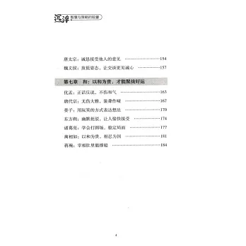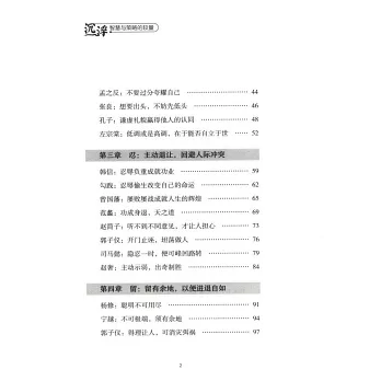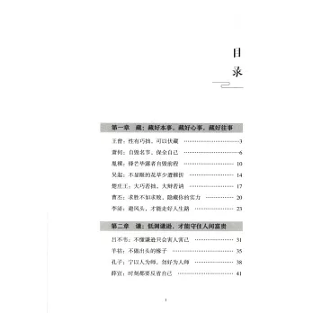 本書分為七大主題,把古人安身立命的處世之道濃縮為“藏”“謙”“忍”“留”“知”“誠”“和”七個字。書里既有精彩有趣的故事,也有深刻的啟發。無論是皇帝、官員,還是文人、百姓,都有各自的處世學問以及對於修心、成事的深刻見解。對於現代的人來說,這些智慧能夠讓我們在遇到問題時,知曉解決之法。