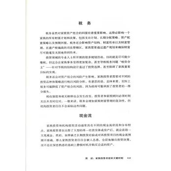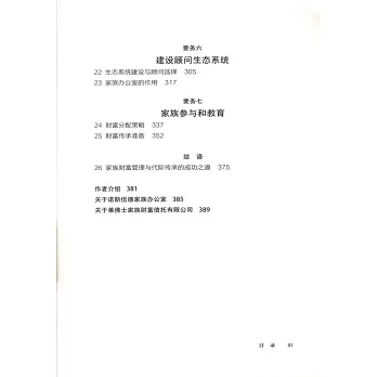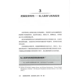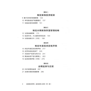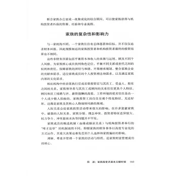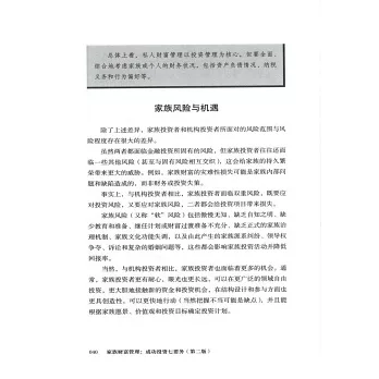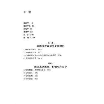 本書內容包括“確立家族願景、價值觀和目標”“剖析家族投資能力、風險狀況以及投資組合構建方法”“構建家族顧問和財富管理支持系統”(專門的家族辦公室或聯合家族辦公室)等,這有利於家族投資者從設定總體目標開始,一步步實施具體投資策略,為做好下一代教育和財富傳承準備,從而完成創富、守富、增富。這本書為投資管理和長期家族財富保值增值提供了堅實、實用的框架,是全球家族成員和財富管理者的重要參考指南。
