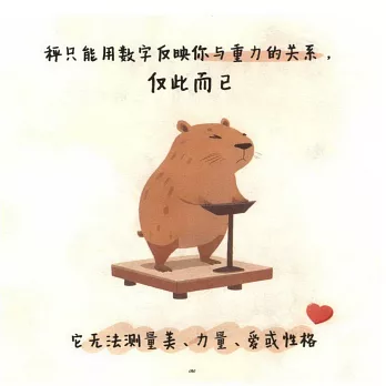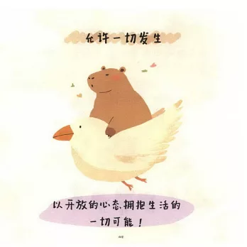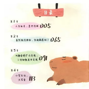 本書是一部以憨態可掬的水豚為主角的漫畫作品,通過其慵懶隨性的生活態度,探討“鬆弛感”人生的真諦。書中,卡皮巴拉化身為心靈的治愈師,引領讀者在繁忙高壓的生活中尋找內心的平和與寧靜,拒絕無謂的內耗,學會順其自然,享受每一個當下。結合萌趣的插畫與幽默的文字,本書展示了卡皮巴拉一系列頓悟的人生哲理,不僅讓人捧腹大笑,更讓人在歡笑中領悟生活的美好與哲學。本書適合對卡皮巴拉形象感興趣並且能共鳴人生感悟的讀者閱讀。